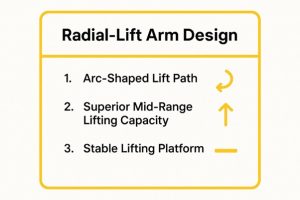 | Radial-Lift Arm Design | Moderate; simpler cylinder layout | Moderate hydraulic resources | Strong mid-range lift capacity & stable platform | Loading trucks, material handling at mid heights | Excellent lifting force, better mid-height reach, stable lift platform |